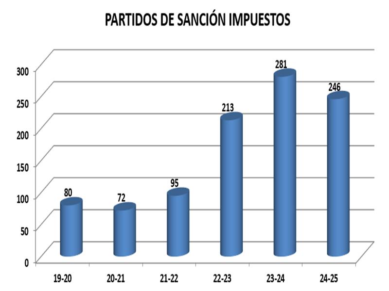 La temporada 2024-2025 finalizó con un total de 480 sanciones de las cuales 230 fueron contra equipos de la competición, 167 contra jugadores y 83 contra delegados. El deporte con más sanciones fue el fútbol sala con un total de 305. Además, estas sanciones provocaron 246 partidos de suspensión para algún jugador o delegado.