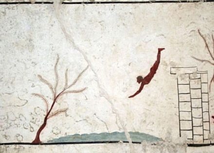 En la Grecia antigua ni nadar ni tirarse al agua formaban parte de las actividades de la élite. El nadador de esta tumba, aislado contra el cielo, simboliza -todas las hipótesis siguen abiertas- la intensidad del momento de la muerte. Este hombre y su salto son la metáfora visual de la transición de la vida terrena a la eternidad.