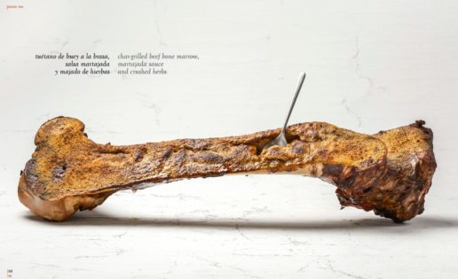 Respecto a las creaciones, es injusto detenernos en alguna en concreto… pero algo os tengo que contar, aunque sea casi imposible seleccionar. Eso sí, aviso, si seguís leyendo tendréis demasiadas ganas de visitar Punto MX para probarlo todo y, de paso, que os echen un autógrafo en el libro. En la imagen principal de esta entrada del blog tenéis el tuétano de buey a la brasa con salsa martajada y majado de hierbas pero en el libro encontraréis más de cien, como los panuchos de cochinita pibil, salsa ixnipek de cebolla morada y chile habanero o la ración de guacamole, chinicuiles, marlín ahumado y queso parmesano madurado 36 meses. Los chinicuiles son unas larvas de color rojizo que viven dentro del agave o maguey (bendito glosario).