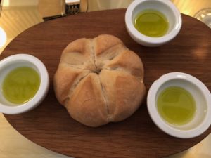 Para comenzar, un pan con mantequilla que puede untarse en aceite de oliva virgen Castillo de Canena y que es para compartir. Se inspira en el cuadro El Almuerzo de Velázquez. Una delicia.