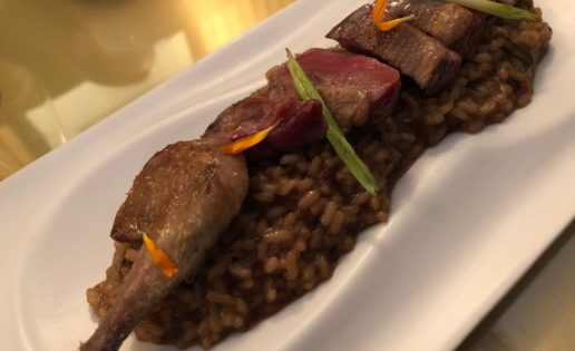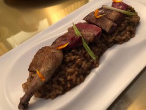 Como plato principal, un arroz meloso de montería. Qué sabor (qué sabor!!) y qué buena cocción. El arroz es la cama de un pichón, cocinado en un horno japonés, en un claro homenaje a la caza de palacio tan frecuente en aquella época. El plato es espectacular, el arroz con verduras tiene un sabor intenso que no resta importancia al pichón, que queda preparado con una textura muy suave. Sin duda, nuestro must en esta comida.