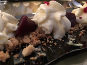 Entrando en materia, arrancamos con el primer plato. Una burrata fresca sobre una base de verduras con pinceladas de pimiento asado y polvo de tomates. Nada más verlo notamos que se inspira en la paleta del pintor. Sobre todo por los coulis de pimiento. La mezcla del queso y las verduras, fresca y sabrosa para después de la ruta, es una muy buena selección.