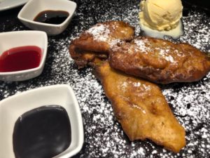 Para terminar (o casi) unos clásicos paparajotes murcianos. Una masa de harina, huevo y ralladura de limón frita con una hoja de limonero en su interior. Un postre tradicional, y quizá el más representativo de la huerta murciana, que estaba exquisito. En El Caldero lo acompañan de una bola de helado de vainilla y sirope de caramelo, fresa y chocolate al gusto.