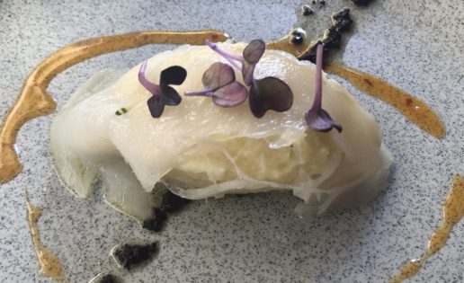 Antes de llegar al plato principal, won ton de pato del Delta del Ebro con crema de calabacín, seta de haya y trufa de verano. La ternura del pato, sumada a la fuerza de la trufa, deriva en una elaboración digna de ser el plato estrella de cualquier carta.