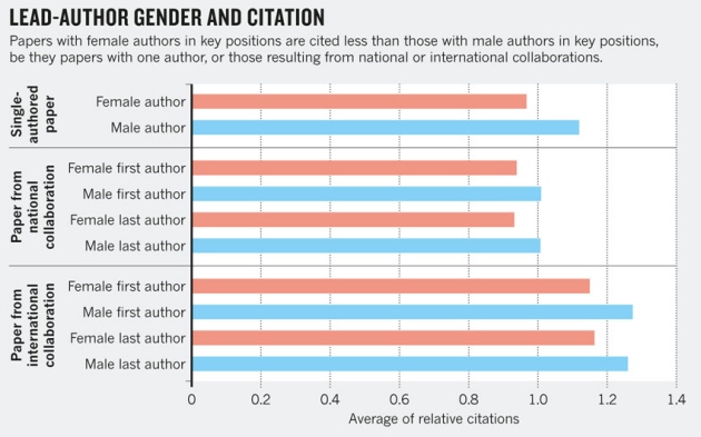 Si existen ciertos sesgos a la hora de evaluar las capacidades de otro, ¿no afectará esto también a la hora de valorar su trabajo? En definitiva, ¿no ocurrirá que los estudios firmados por mujeres y hombres serán evaluados de distinta forma? Eso parece. Un famoso estudio publicado en Nature en 2013, que analizó 5.483.841 artÃculos con 27.329.915 autores, averiguó que los artÃculos con mujeres en posiciones dominantes eran menos citados que aquellos en los que los hombres estaban en la misma posición. Es decir, en el mundo cientÃfico, llamarse John abre más puertas que llamarse Jennifer. Otro estudio más reciente concluyó que, globalmente, los artÃculos en los que una mujer es primera autora tienen un 6% menos de citas.