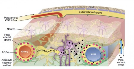 Nedergaard y su equipo demostraron en ratones que el cerebro posee una especie de sistema de tuberías superpuesto a los vasos sanguíneos (un tubo dentro de otro tubo). Este sistema bombea fluido cefalorraquídeo (LCR), el líquido que rodea el cerebro, a través del tejido cerebral, desde las arterias a las venas, para lavar los residuos almacenados en los espacios que quedan libres entre las células del cerebro. Este sistema de limpieza del cerebro (denominado glinfático) trabaja fundamentalmente mientras dormimos, de ahí que el sueño literalmente nos “refresque” la mente.