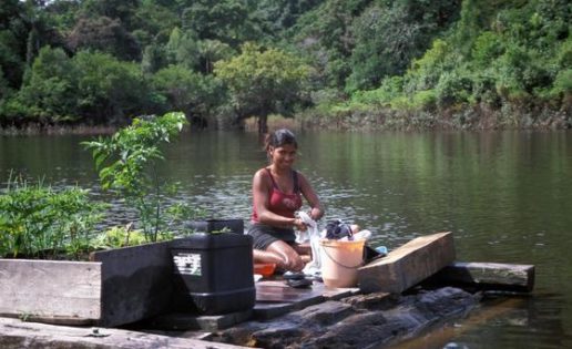 De pronto, la mata se interrumpió y avistamos un trecho de tierra pelada que descendía suavemente hasta el agua. En lo alto, una precaria cabaña de madera descansaba sobre delgados pilotes. En la improvisada playita flotaba una pequeña plataforma que hacía las veces de embarcadero. Era un sitio, una pequeña hacienda de caboclos, incrustada en la selva. Allí vivían Nazaré y su familia, una esposa y seis hijos, la mayor, de diecisiete años.