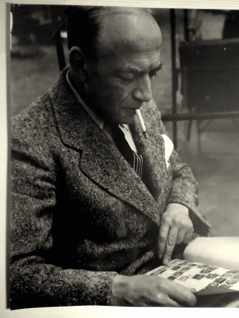 Subí las escaleras todo lo rápido que pude y ya sustituyendo el nerviosismo por la alegría que siempre me ha proporcionado todo lo que se relaciona con lo que estudié. Al llegar a la casa, me disculpé tantas veces como aire me quedaba y Dominique, con muy buena educación francesa, me dijo que no me preocupara, que había pasado la mañana trabajando. Me condujo hasta una habitación donde abrió un armario. Tomó un álbum marrón de la parte alta. Era uno de esos viejos álbumes donde las fotografías están cubiertas por papel transparente un poco pegajoso. Lo abrió por el final. Allí estaba Adrien fumándose un cigarrillo —Raymond Aron cuenta en sus «Memorias» que su hermano consumía dos o tres paquetes al día; de hecho, murió de un cáncer de pulmón—, vestido elegantemente —había abandonado la vida mundana, pero no la estética— y mirando sellos, la afición que conoció durante su exilio en Suiza y a la que se consagró desde la posguerra hasta su fallecimiento, en 1969. La imagen había sido tomado, creía Dominique, en los años sesenta.
