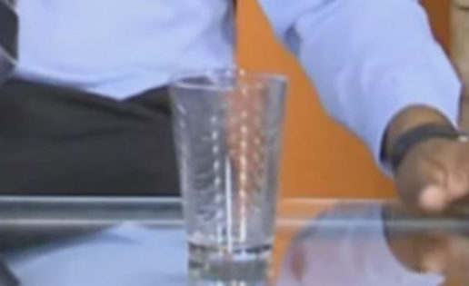 Las imágenes muestran como dos presentadores están charlando entre sí cuando el vaso se desplaza sobre la mesa.