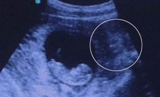 En la imagen se puede apreciar un feto que tiene unas 9 semanas de gestación y a su lado aparece una figura con dos ojos y un cuerpo que parece estar observando al bebé.