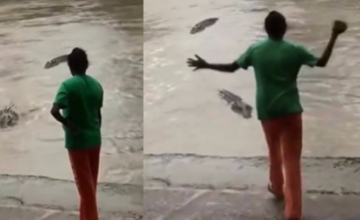 En las imágenes se puede ver como logra ahuyentar a un enorme cocodrilo solo utilizando una chancla.