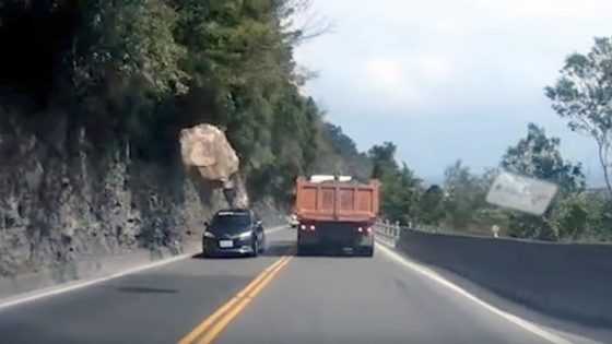 El suceso ocurrió este martes en una autopista que une la ciudad de Hualien con Taipéi, en Taiwán, China. Todo fue registrado por la cámara de seguridad del vehículo, la roca cayó de la montaña a la carretera, muy cerca…