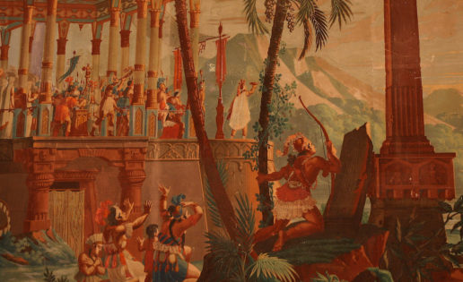 Se trata de la colección mas completa de papeles pintados de los Reales Sitios. Y posiblemente los mejores sean los panorámicos que decoran las paredes de aquel despacho, representando, como en una escenografía teatral, a españoles e incas con vestimentas de época y algo de influencia napoleónica en plena Conquista del Perú. Son pliegos exclusivos, pintados a mano, de gran calidad y nunca más reproducidos, de una anchura de 2,50 metros, con unas restauraciones que no disimulan las intervenciones y que soportan mal la luz directa del sol. Son obra de Joseph Dufour en 1820 realizados en Francia.