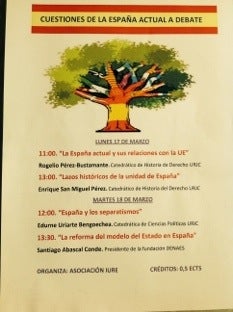 Pero no el único. Precisamente esta semana, estudiantes del colectivo Iure de la universidad Rey Juan Carlos en la que imparto clase me informaron de que más de 100 copias del cartel que figura más arriba y que habían sido colocadas en el campus de Vicálvaro fueron arrancadas por los radicales en una tarde. En este caso, porque las conferencias que impartíamos versaban sobre la unidad de España o porque el cartel exhibía los colores de la bandera nacional o porque figuraba un representante de Vox.