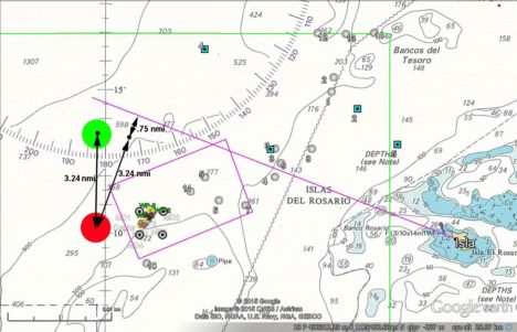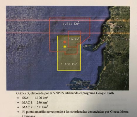 La sucesión de escritos y comunicaciones es como sigue. Desde febrero de 2015, un mes después de presentar su primer proyecto (poco arqueológico, que dijimos aquí) Roger Dooley y MACS presentaron un primer polígono de 256,07 kilómetros cuadrados en aguas colombianas cercanas a Cartagena de Indias, en el cual pretendían explorar la presencia del galeón. Esa área fue delimitada en varias comunicaciones, pero en especial en un informe a la ministra de Cultura, Mariana Garcés, de fecha 19 de mayo de 2015.
