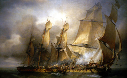 He visto cuadros de este barco y de su hazaña, en diciembre de 1798, ¿5 años ya?. Circulan infinidad de grabados de la captura de la fragata inglesa Ardent por la corbeta francesa Bayonnaise, la verdad es que eso no se lo esperaban los rosbifs… se las hacían muy felices abordando una corbetilla, y se vieron desbordados por un abordaje que nunca esperaron… la verdad que a su tripulación no les quedaba otra… o eso o a pudrirse a un pontón. ¿Cómo se llamaba su comandante?, coincidimos en Brest…, Baptiste… Jean-Baptiste-Edmond Richer, eso es. Que una corbeta capture ella sola a una señora fragata es algo que no se ve todos los días y si la fragata es inglesa, nunca en esta guerra. No me extraña que hicieran tanta propaganda … luego los ingleses con sus explicaciones…, que si la nuestra estaba sobre marinada, que si la suya había perdido muchos tripulantes por la gran cantidad de presas efectuada, que si la primera descarga había eliminado a todos sus oficiales… Pues claro, ¿qué esperaban?… disculpas de mal perdedor.