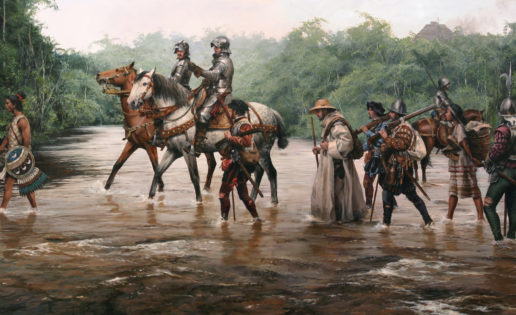 «Propuso Cortés ir a México. Y para que le siguiesen todos, aunque no quisiesen, acordó quebrar los navíos, cosa recia y peligrosa y de gran pérdida». Ese es el relato de López de Gómara. Ahora, un nuevo cuadro del pintor Augusto Ferrer-Dalmau, nos muestra qué pasó después. Refriegas y alianzas, pero sobre todo la intuición de cómo los súbditos de Moctezuma se acabarían uniendo a la aventura. Que no era otra que conquistar el imperio azteca. La marcha hacia Tenochtitlán. Pero en esta ocasión, Ferrer-Dalmau ha contado con la inestimable ayuda del historiador David Nievas Muñoz, que le ha permitido elaborar una interpretación fiel de aquel momento. Así, el estilo que le ha convertido en el más afamado pintor de la historia militar de España, tiene un valor añadido, en el empeño de crear una imagen fidedigna de lo que ocurrió. Tradicionalmente se ha pintado aquella aventura con armas más avanzadas, atuendos distintos, detalles que no cuadraban. Ahora podemos asomarnos al aspecto más plausible de una expedición cuyas formas recuerdan más las armaduras tardomedievales que las del XVII.