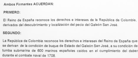 Como conclusión, para Lancho, «los derechos que pueda invocar Colombia solo pueden ser dos y ninguno exclusivo frente a España: su compromiso irrevocable con la protección y conservación de ese patrimonio y su vinculación histórica al mismo puesto que son una sociedad hispánica continuadora de aquellos españoles europeos y españoles americanos que se hundieron combatiendo por la misma causa. En ese punto, España debe hablar de patrimonio común y patrimonio compartido y fijar su política y su firme propuesta para todo el continente».
