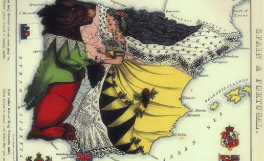 En 1869, William Harvey elaboró un atlas para niños, el “Geographical Fun”. Un profesor de principios de época victoriana con ideas rígidas sobre las diferentes naciones europeas. Así fue representada España y Portugal: ¿bailamos?