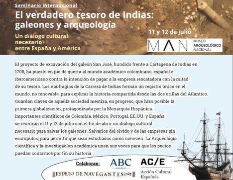 El 11 de julio, en el MAN (calle de Serrano 13, MADRID) estaremos, desde las 09:45 de la mañana escuchando a grandes académicos de Colombia, México, España, Portugal y EE.UU. para conocer sus visiones sobre la polémica y sobre la mejor manera de investigar un galeón, que se aleja diametralmente de la seguida por el Gobierno colombiano.