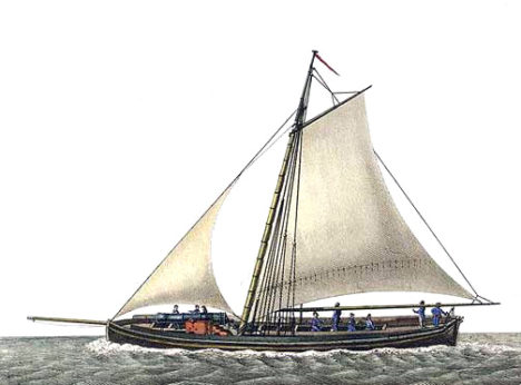 Cañonera española navegando a la vela y plano de otra.