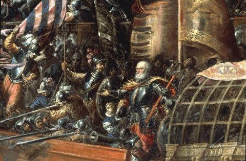Y de las salas del Escorial nos vamos a Venecia. A las bellas estancias del Palazzo Ducale. En sus paredes Vicentino recreará de forma magistral la batalla. Las aguas del canal, también serían testigos de la victoria. Cada vez que veo los detalles de la pintura, es fácil descubrir detalles nuevos. Además unos dotados de un gran realismo. Sustituía una pintura sobre el mismo tema obra de Tintoretto perdida en el incendio que sufrió el palacio en 1577, y en cuya ejecución fue ayudado precisamente por Vicentino. Los principales pintores italianos al servicio de la pintura del momento; la gran victoria sobre el Otomano. En la recreación de Vicentino de nuevo un rompimiento de gloria preside desde los cielos el combate naval. Su abigarrada composición, repite la estructura, situando el momento de la pintura en el momento culmen de la batalla. el momento junto antes de la victoria. Pero hay una importante novedad, una a tener muy en cuenta. Los dorados paños de la bandera veneciana, junto al León de San Marcos figuran como principales protagonistas. La serena república ostenta una relevante posición italianizante y al fin y al cabo eran los mecenas. Los que pagaban en contante y sonante. Significativo es el detalle de la pintura del mismo Venier, sobresaliente en su estatura y fácilmente identificable con su barba blanca y su destacable fisonomía. Armadura a la altura de su status y baston de mando en una de sus manos. Pero es curioso, porque en el episodio de la lucha que se refleja en el cuadro como escena, y que parece contra la Sultana, disponen a Venier como el protagonista principal. En realidad, lo ocurrido en ese episodio fue algo bien diferente y tuvo como protagonista al episodio clave de la batalla, con Don Juan De Austria como protagonista, en el instante en el que Contarini embistió y hundió una galera turca que se dirigía contra Colonna, mientras que las galeras de Juan Loredano y Catarino Malpieri fueron destruidas cuando se dirigían en ayuda de La Real. En esas que Don Álvaro de Bazán y su capitana La Loba, llegaban para destrozar a cañonazos una galera turca y embistió a otra en la que él mismo dirigió el abordaje recibiendo dos balazos que no traspasaron su armadura. Venía también Don Juan de Cardona, quién se lanzó contra la galera de Pertev Pachá cuando éste estaba enzarzado con la de Paolo Ursino. Por cierto, y a este propósito señalaremos la descripción magistral, y en un tono romántico (la pinta en el siglo XIX) que hace Juan de Luna y Novicio, en la que nos describe el asalto desde la proa de una de estas naves, y que recoge detalles tan reales como la sierra de los espolones de proa que ordenó Don Juan de Austria momentos antes de la batalla, para hacer más efectivos sus embestidas. La pintura nos sirve la historia en bandeja. Es todo un deleite.