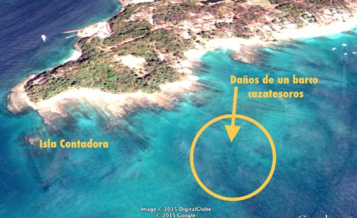 En la foto superior [o en la más clara que está justo debajo, si se amplía], pueden verse dos curvas paralelas de puntos oscuros, que son las huellas típicas que deja en el fondo un barco cazatesoros. En zonas de poca profundidad, y con potentes deflectores de hélices, aceleran sus motores al máximo arrojando al fondo marino bajo la nave un flujo de agua tan violento que despeja toda la arena y elementos de poco peso, dejando unos ominosos cráteres a su paso. Unido a magnetómetros y detectores de metales, es perfecto para quien busca oro y plata y poco o nada le importa el contexto histórico del yacimiento. Estos cráteres son las cicatrices que un cazatesoros deja en nuestra historia, las huellas de quien ha borrado para siempre parte de una historia importante, la de quienes se hundieron en el naufragio, con el fin de recuperar a toda prisa los objetos de valor comercial. Son las pruebas dolorosas de la vulnerabilidad del patrimonio cuando el Estado decide disponer de él no para preservarlo a las generaciones futuras con quienes pueden extraer conocimiento de sus restos, sino para repartirlo como un botín y venderlo como si solo fuera oro.