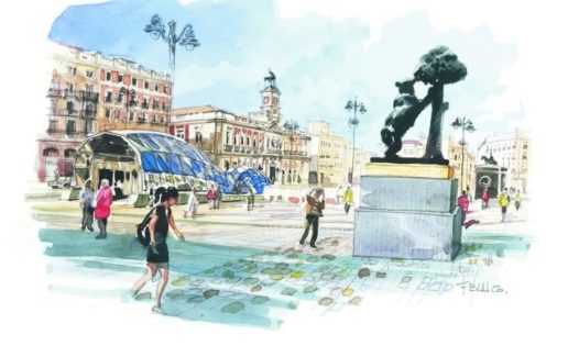 Una de las últimas a las que he tenido acceso es una magnífica y muy bella publicación realizada en formato libro llamada Madrid. Acuarelas de viaje (Anaya Touring). En ella podemos ver más de 80 acuarelas realizadas en las calles y los jardines de Madrid por el madrileño Fernando Blasco a lo largo de más de cinco años. A estas bellísimas ilustraciones acompañan los inspirados textos de Pepo Paz, que realiza, a través de una serie de itinerarios que comienzan en la Puerta del Sol, haciendo un recorrido breve por la historia y el urbanismo de la ciudad en la que reside, y bajo su mirada va desgranándose el devenir de sus gentes, calles y plazas, edificios, fuentes, palacios y conventos.