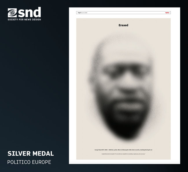 El premio Excellence fue para el periodista Fevzi Yazici por su obra a tres páginas titulada «El arte de la oscuridad» publicada en The Washington Post en mayo. Trabajo que rezlizó desde la cárcel en Turquía. Exdirector de diseño del periódico Zaman, fue encarcelado en 2016 como parte de una ofensiva contra la libertad de expresión en dicho país. Yazici apela a su condena de 11 años y 3 meses de prisión. Las obras premiadas presentan varias de sus ilustraciones dibujadas en su celda.