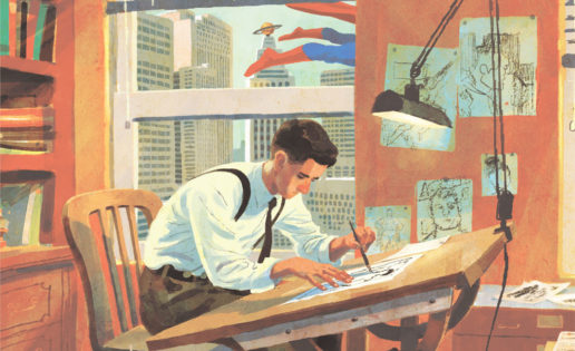 La biografía de Joe Shuster está contada de forma extraordinaria por Voloj y representada también de forma extraordinaria y muy especial por Campi, en la que cada viñeta contiene un pedazo de la historia del cómic estadounidense junto con los dibujos y un estilo que juega con el color al más puro estilo del pintor Edward Hooper, en el que la luz cálida expresa candidez y cercanía de una historia que te traslada a los años 30. Desde cómo se conocieron los autores y dieron vida al personaje hasta como intentaron vender el proyecto a las editoriales para que al final fueran explotados, engañados y despojados de sus derechos. La narración comienza con una primera viñeta ficcionada en la que Shuster es ayudado por un policía y que sirve de excusa para contar la historia a través de un largo flashback. A partir de ahí, los hechos que nos cuentan los autores están inspirados en la vida real de Joe Shuster y Jerry Siegel.
