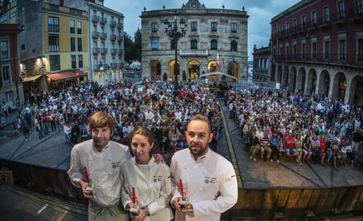 Cuarta edición del Festival Sabores del Arco Atlántico. De nuevo la Plaza Mayor de Gijón llena durante dos días para asistir a las demostraciones en directo que, desde un gigantesco escenario de conciertos, hacen los cocineros premiados, representantes de las Comunidades atlánticas españolas y de algunos países limítrofes. Los seis de este año han sido Elena Arzak, Sergio Bastard (La Casona del Judío, Santander), Iván Domínguez (Alborada, La Coruña), Dieter Koschina (Vila Joya, Portugal), Dylan McGrath (Rustic Stone, Dublín) y, por parte asturiana, Ricardo González Sotres (El Retiro, Pancar). Como miembro del jurado (junto a Xavier Agulló, Capel, Juan Antonio Duyos, la concejal gijonesa Ana Braña, y David Fernández Prada, que es el organizador) me tocó, como hace dos años, presentar a varios de estos cocineros en el escenario. Impresiona mucho el lugar y el ambiente, especialmente la primera noche, cuando la presencia de Elena Arzak supuso un gran reclamo. Incluso la alcaldesa de Gijón, Carmen Moriyón, estuvo allí para entregar los premios ese día. Se trata de un formato único (no conozco ninguno igual en España) que acerca la alta cocina a la gente de la calle. Los cocineros, como estrellas del rock, elaboran un par de platos en vivo y en directo. La verdad es que sorprende el interés que muestran los asistentes. Además, por la mañana, los mismos cocineros hacen un show cooking para un grupo de profesionales asturianos de la hostelería.