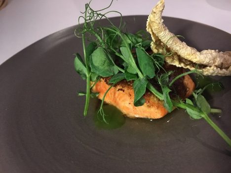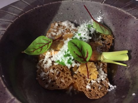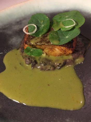 Algunos de esos platos resultaron verdaderamente notables. Me quedo, por encima de todos, con el pez sierra, impecable de punto, con frijoles guisados a la manera tradicional y presentados sobre una hoja de garra de león que les aporta un sabor especial. Al lado, una crema de hierba de conejo con matices muy peculiares. La combinación de todos esos ingredientes funciona perfectamente y nos trae sabores desconocidos.