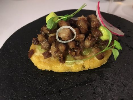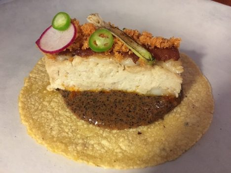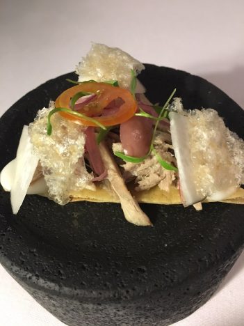 Otro gran plato el taco de lechón con mole de chicatana. Me decía el maitre de Baños, que le ha acompañado en este viaje a España, que este es uno de sus mayores éxitos en Pitiona. El cochinillo perfecto de sabor y de textura, y debajo ese mole de hormigas chicatanas (las también conocidas como culonas) que es por sí solo un espectáculo, con una complejidad increíble. Encaja perfectamente con la tradición de los moles oaxaqueños.