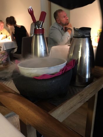 No tenía necesidad Baños de traer a Madrid un postre con nitrógeno. En su restaurante sigue sorprendiendo seguro, pero aquí ya no nos causa efecto alguno. Además, tampoco el churro-nitro que prepararon en la sala aportaba nada. Complicado de comer y sin apenas sabor. Lo salvaba algo el chocolae de agua servido en una tacita y pensado para mojar el churro, hecho con arroz con leche como base. Bastante mejor el flan de requesón, acompañado por una copa de tequila 1800, patrocinador de estas jornadas.