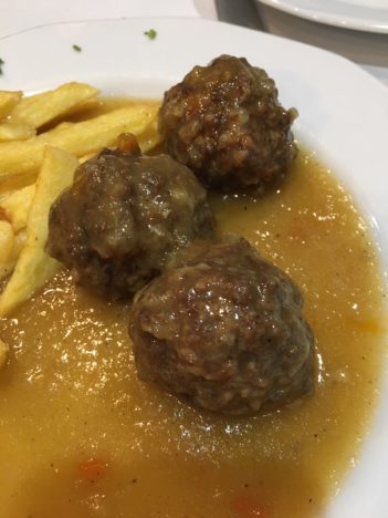 Mi última comida allí fue hace unos días, sentado en una de las mesas altas de la barra. De aperitivo los imprescindibles torreznos. Luego, una ensalada de buen tomate con cebolleta y aceite de oliva de calidad. A continuación dos guisos: cardo y borrajas con almejas, y unas pochas con perdiz. Bordan los platos de cuchara en El Fogón, y estos dos son perfectos ejemplos. Como bordan las albóndigas, a las que también dedicamos un rato. Para terminar con ese rabo de toro del que ya les he dicho todo (aunque no de las patatas fritas, a la altura). Un trozo de tarta de queso, muy rica, fue el colofón perfecto. No se puede pedir más. Larga vida a Trifón Jorge y a su casa.