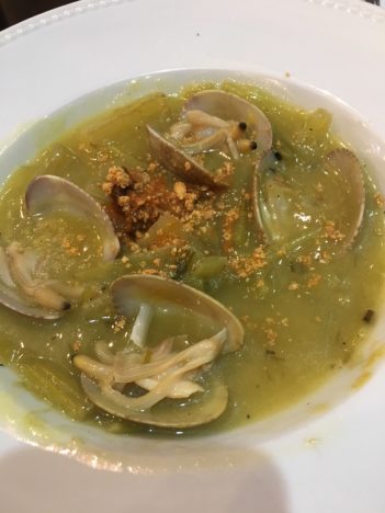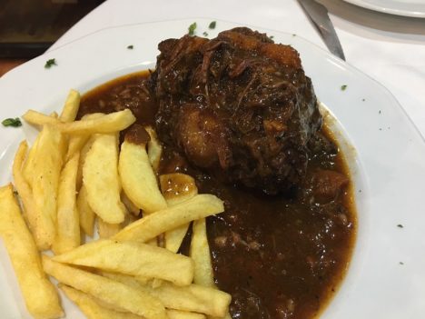 En estos quince años he visitado muchas veces El Fogón de Trifón. En un reciente artículo publicado en el suplemento Jantour de El Correo y en otros periódicos de Vocento, que titulé “Refugios gastronómicos”, lo citaba como uno de esos sitios a los que acudo cuando quiero sentirme como en casa, por cocina y por trato. He tomado allí caracoles, ensaladas de pamplinas, tomate con ventresca, perdiz escabechada, croquetas de jamón, de morcilla o de rabo de toro, mollejas de lechal, manitas de cordero con tomate, cocochas de merluza, chipirones encebollados, pescados de calidad y carnes a la altura, empezando por las chuletillas de lechal. Y por supuesto los guisos de rabo de toro o de gallo de corral que junto a los excepcionales callos son para mí el trío de ases de esta casa. Como ven, nada de sorpresas. Todo el repertorio de la mejor cocina tradicional madrileña perfectamente ejecutada.