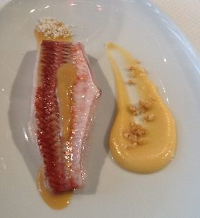 Más mar con las quisquillas con piel de patata. En el interior de una latita, gel de cabezas de quisquillas y puré de patata ratte con su piel. Sobre ellos, las colas de las quisquillas salteadas con aceite de ajo y una salsa asiática conocida como “sriracha” que aporta el toque picante. Sobre la tapa de la lata, las cabezas de las quisquillas salteadas. Otro acierto. Es tan alto el nivel que un plato de bacalao “blanco y negro” (confitado con pilpil de piparras y ajo negro), pese a la calidad del pescado y el perfecto punto que recibe, queda algo eclipsado. Y es que le sigue nada menos que el salmonete, el pescado que nunca falta en los menús de Casa Gerardo y al que le han dado todos los tratamientos imaginables. El de esta temporada está hecho a baja temperatura. Una pieza espectacular que se acompaña con puré de coliflor y kimchi (en la foto que encabeza este post). Delicadeza e intenso sabor en un mismo plato.
