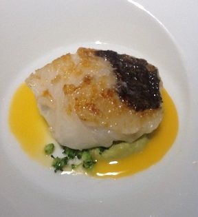 Probé la ostra con caviar cítrico, jengibre y caldo de las vainas del guisante, y el bonito “gin tonic” con salvia y ajoblanco de coco. En este último el bonito se marina en gin tonic. La verdad es que el plato está bueno, y el pescado impecable, pero del GT quedan apenas unos leves matices amargos. Rico el canelón de changurro con espuma de hinojo y manzana verde; complejo el foie con remolacha y regaliz; y muy buena la merluza con brócoli y una bilbaína de pomelo que le aporta contrastes ácidos (foto que encabeza el post).