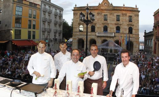 Un cocinero con tres estrellas Michelin en un enorme escenario en la Plaza Mayor de Gijón. Y más de 1.700 personas llenando la plaza, siguiendo con atención sus explicaciones y ovacionándole luego. La simbiosis entre la alta cocina y la gente de la calle, que no están tan alejadas como algunos nos quieren hacer creer. Un logro del Festival del Arco Atlántico que este año ha celebrado su segunda edición en la ciudad asturiana y que se consolida como un encuentro gastronómico con enorme atractivo. No conozco nada parecido en España ni creo que haya muchos eventos similares en el mundo. Siete cocineros de primer nivel (todos con estrella) ofreciendo un “show cooking” en directo, no para profesionales sino para un público con libre acceso que puede ocupar las 500 sillas instaladas en la plaza o quedarse de pie alrededor de las mismas o bajo los soportales. En el escenario, propio de un concierto, una cocina con todo lo necesario y dos gigantescas pantallas. A lo largo de dos jornadas, estos destacados cocineros elaboran sus platos en vivo y explican los productos y las técnicas. Son chefs que provienen de países y regiones españolas que se sitúan en el llamado Arco Atlántico y que han sido elegidos por un jurado de especialistas. De Portugal, Ricardo Costa, de The Yeatman (Oporto); y de Francia, Nicolas Magie, de Le Saint James (Bouliac, Burdeos). De España, por Galicia, Pepe Solla (Casa Solla); por Cantabria, Óscar Calleja (Annua); por el País Vasco, Eneko Atxa (Azurmendi); y por Asturias, José Antonio Campoviejo (El Corral del Indiano) y Gonzalo Pañeda (Auga). Todos fueron muy aplaudidos, pero los dos “locales”, Atxa y Solla se llevaron la palma, especialmente el último, que es un verdadero showman y que hizo una gran presentación del producto gallego y de la tradición. También gustó mucho Óscar Calleja con sus platos de ostras de San Vicente de la Barquera.