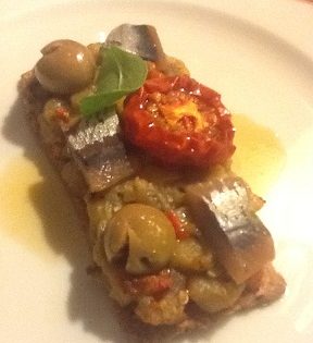 Tras este inciso, que no me hubiera importado repetir, retomo el menú con una actualización de la popular oliaigua, una sopa de tomate que forma parte del acervo gastronómico menorquín. En verano se suele tomar con higos por lo que el cocinero le añade un helado de figat (mermelada de higos) y gominolas de aceite de oliva para redondear un gran plato. Luego una coca integral (foto superior) de escalibada y sardinas “pinxes” (prensadas y saladas al estilo de los arenques, producto con clara influencia de la deminación británica). Es lo más flojo. Sobra el efectismo de la campana de humo, falla la masa de la coca, demasiado dura, y unas potentísimas aceitunas anulan otros sabores. Una pena, porque la presencia y las sardinas eran de diez.