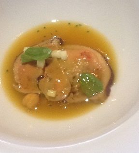 Probamos esta semana su menú largo, el de 47 euros, con algún añadido extra. Y disfrutamos mucho. Como aperitivos, unos mini bollos preñaos que se comen muy bien con ese reducido tamaño, y las ya citadas croquetas de compango, cremosas, ligeras y con mucho sabor. Empezamos con uno de los platos que repite desde su apertura y que está francamente logrado: el corte de foie asado en hierbas con un caldo de cocido y trocitos de manzana. Ligereza y suavidad del hígado, intensidad en el caldo. Muy bueno también las verduras de temporada con piel de cochinillo en su jugo. Y sobresaliente la crema de coliflor con anguila ahumada. Para la crema utiliza leche del mismo pueblo, mucho más cremosa y grasa, lo que le da una textura y un sabor muy especiales, con el perfecto contraste de la anguila ahumada.