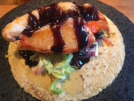 Por medio, también, un taco de bogavante con un demi-glace de frijoles negros. El cocinero logra una reducción máxima de los frijoles cocidos hasta lograr un concentrado espeso, oscuro y brillante, puramente vegetal, con todo el sabor de la legumbre, pero que recuerda a las mejores demi-glaces de carne. Técnicamente impecable. Combina además a la perfección con el bogavante.