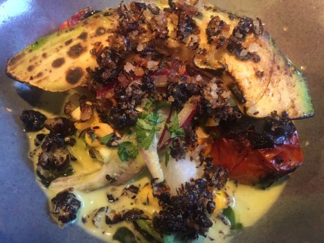 Las chicatanas, de las que sólo se come la parte gruesa, el abdomen, se presentan en un recipiente tostadas (foto que encabeza este post). El camarero las muele en un molcajete con un poco de sal de chiltepín, uno de los chiles más picantes que existen, y las sirve luego sobre un ceviche tatemado al que aportan su sabor a frutos secos, café y cacao. Añade también un poco de aceite de cilantro y mezcal. El ceviche tatemado de rape curado es por sí solo otro gran plato. No es habitual encontrar las verduras tatemadas (tostadas en comal) en un ceviche mexicano pero dan un excelente resultado.