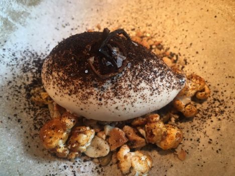 Así, los chinicuiles, tostados, se sirven sobre un guacamole especial que lleva hinojo, parmesano, chile serrano y granada. Esta evolución del guacamole está buenísima, pero se refuerza aún más con estas pequeñas larvas que aportan su peculiar sabor terroso y una textura crujiente que hace el papel de los tradicionales totopos.