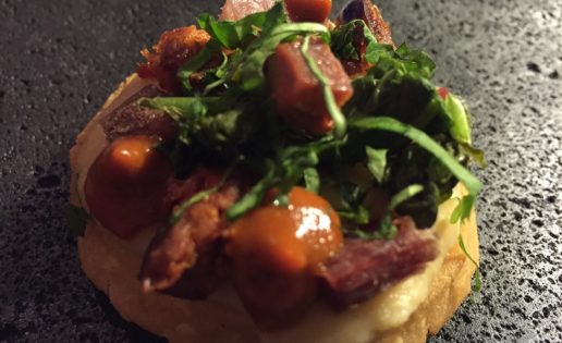 El plato más representativo de la cena fue para mí el sope de cocido de Lalín, de Diego (foto que encabeza esta entrada). Un puntazo. Reconvertir el cocido gallego en un sope (pequeña tortilla de maíz frita sobre la que se pone algo). En este caso, sobre la masa iba una crema de garbanzos, que recordaba mucho a un hummus, y encima de ella trocitos de lacón y chorizo ceboleiro, grelos picados y chiles. Magnífico plato que resumía muy bien el espíritu del menú, la fusión entre Galicia y México.