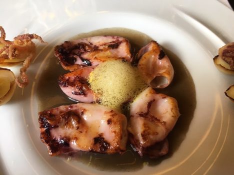 En casi todas las cartas y menús Medina emplea huevos de gallina de Mos. La versión de esta temporada va con un suquet de camarones, en perfecta combinación. Tiempo de producto con los chipirones a la plancha sobre un caldo de sus interiores, azafrán y patata con toques cítricos. La potencia del caldo contrasta con la delicadeza de los chipirones. Más materia prima: una ventresca de bonito, impecable de punto, en un jugo de encurtidos que la realza. Y más aún: bogavante azul en salsa de vino blanco y lardo de Joselito. Bogavante de calidad, que además por su mayor sabor encaja mejor con la salsa de vino que en una anterior versión en la que Medina empleaba cigala y que quedaba un tanto anulada.