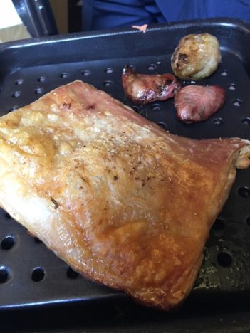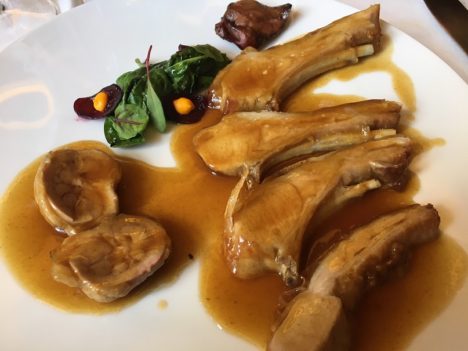 Cerramos con una carne. Nos presentan en la mesa un costillar de lechal asado en su jugo con hierbas como el tomillo. En A’Barra la sala tiene su protagonismo. Por eso Jorge Dávila trincha el costillar y lo emplata con habilidad en el gueridón (foto que encabeza el post), dejando las costillas y acompañando la carne con sus riñones y asadura, una exquisitez. El lechazo es de tan solo 9 o 10 días, por lo que a su carne le falta un poco de sabor, algo que se compensa al estar especialmente tierna y con una textura muy suave. También el jugo contribuye a reforzar ese sabor.
