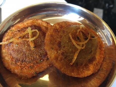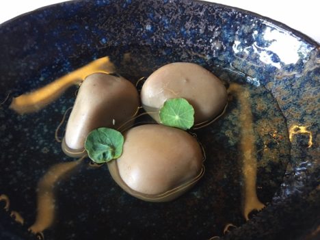 Comenzamos con cuatro aperitivos. Un capuchino de avellana y café (le gusta al cocinero abrir boca siempre con un caldo o similar), un excelente tartar de lomo de cerdo de Joselito, un churro de bacalao (más efectismo que otra cosa), y un ravioli de hígado de cerdo a la pimienta a modo de dumpling chino. Está bueno, pero falla el crujiente por lo que no acaba de estar redondo.