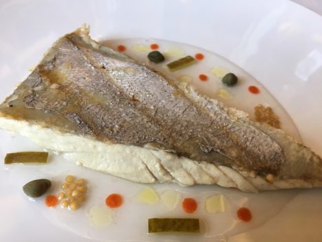 De las entradas de la carta probamos el gazpacho a las piedras. Un agua de tomate casi traslúcida en la que aparecen unas piedras de aceituna negra. Trampantojo divertido, aunque convendría reducir la cantidad de grasa exterior de esas piedras, que hacen algo pesado un plato que debería ser muy ligero. Por el contrario, una combinación veraniega, la sopa fría de lechuga con remolacha, manzana en texturas y piñones tostados, resulta magnífica. Tras ellas se sirve en la mesa el pan casero, que desde hace algún tiempo se presenta en un plato caliente para mantener su temperatura. Pan, por cierto, de mucha calidad.