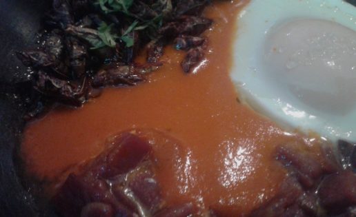 Como plato estrella, una sartén, un icono de Viridiana. Con la sorpresa de que ahora la prepara con esos pequeños saltamontes ahumados que se ha traído de México. Pueden verla en la foto que encabeza el post. Los chapulines aportan un toque de humo y ligeramente ácido, su textura crujiente, que se integra perfectamente con un huevo, tacos de jamón ibérico, y una salsa de tomate y chile chipotle bien reforzada con abundante cilantro. Magnífico. Una forma de acercarse a la cocina de los insectos.